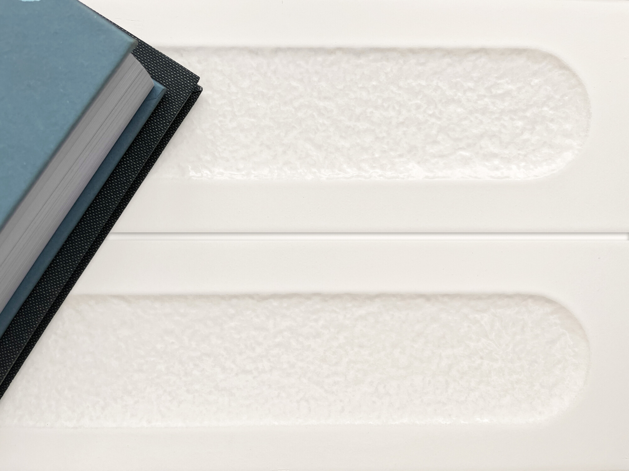 Vertikal angeordnet entstehen Die Bibliothek: eine Landschaft aus konkaven und konvexen Reliefs, die sich wie Buchrücken abwechseln und an Regale voller Wissen und Stille erinnern. Eine Hommage an die Ruhe und Intimität, die Bücherreihen vermitteln, wo Keramik nicht nur verkleidet, sondern begleitet und dem Raum Charakter verleiht.